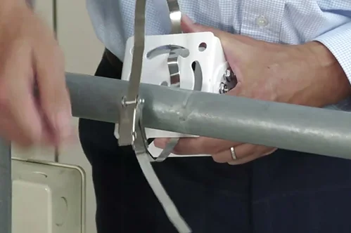 付属のステンレスバンドでポールや柱に固定するだけ。