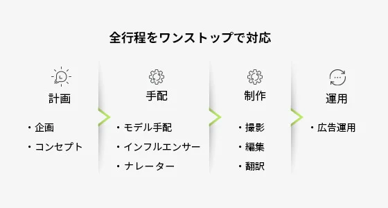 撮影・編集、モデル手配、翻訳、広告運用、それぞれ別の会社に依頼して余計な手間が掛かっていないでしょうか。