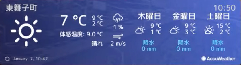 天候や気温、風速、降水量、さらに最大3日先までの天気情報を表示できます。