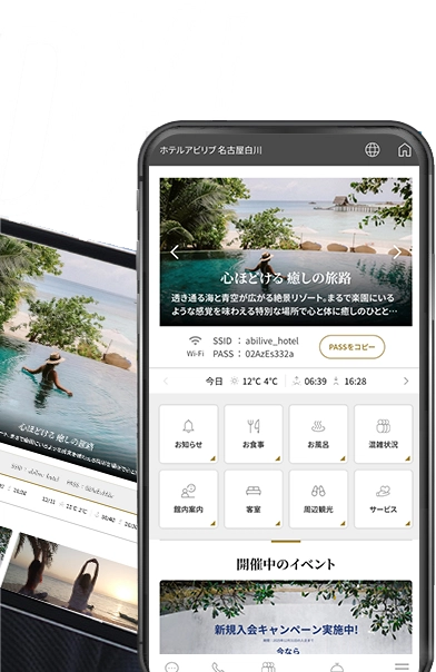 「アビコンシェルジュ」は、ホテル・旅館の館内案内をデジタル化し、お客様のスマホやホテルタブレットに表示、国内旅行客はもちろん、インバウンド・訪日外国人観光客への施設案内をスムーズに行うことができるサービスです。