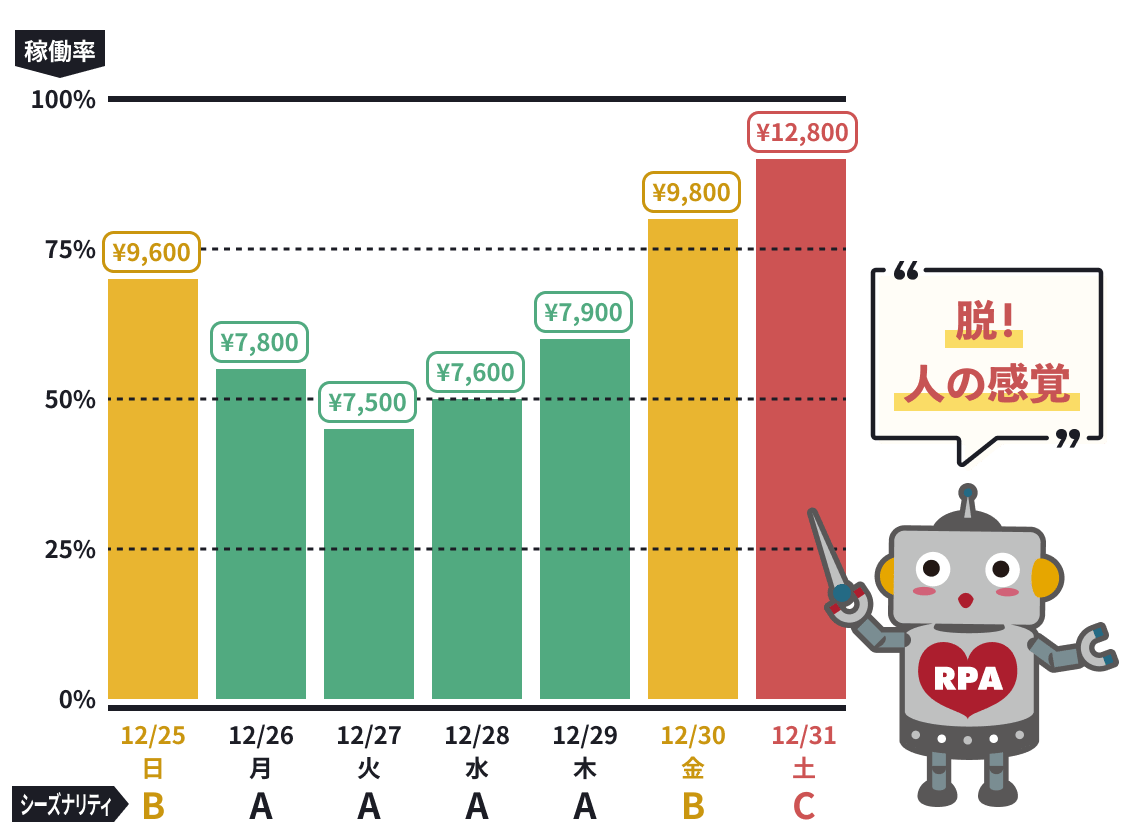 価格理論(価格の根源的分岐点による値決め)に基づき宿泊料金の下限料金と上限料金を定義し、その料金幅の中で稼動率に応じて料金を細かく(14段階×4ランク=56通り)設定しています。料金のパターンが多いと運用が大変になりますが、運用はロボットに任せます。