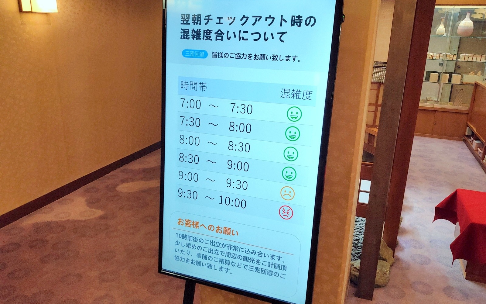 感染症対策では、日々の検温のみならずロビーにチェックアウト時の混雑状況が確認できるモニターを設置。