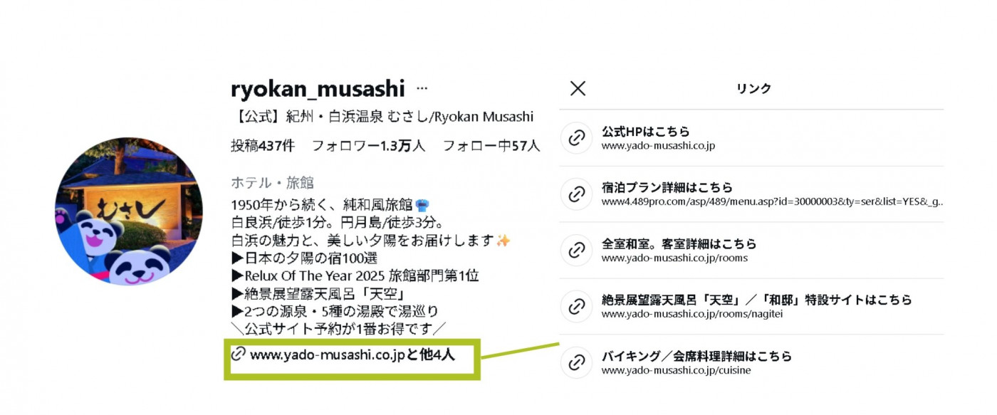 ✓本アカウントでは、「どんな宿か」が一瞬で伝わり、公式HPへの導線も明確に設計されています。