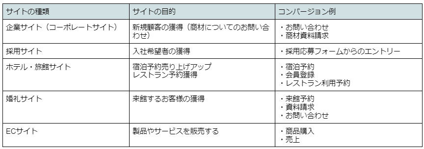サイトの目的に応じて、設定できるコンバージョンは異なります。