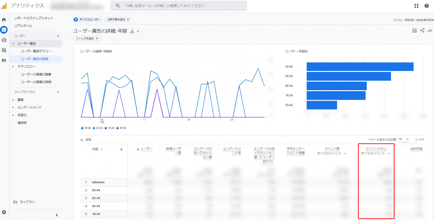 なお、GA4で表示される年齢データは、Googleアカウントにログインし、年齢情報の計測を許可したユーザーのデータのみ集計されます。それ以外のユーザーデータは「unknown」に分類されます。