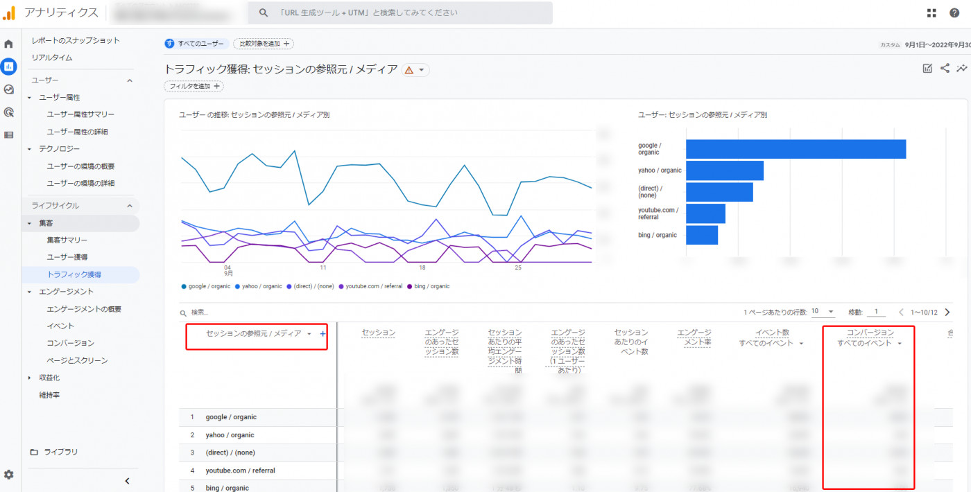 この画面では、各流入経路におけるコンバージョン数値を確認することが可能です。