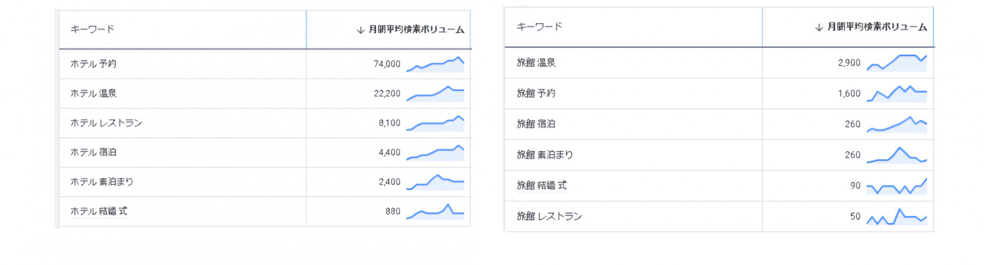 ホテルと旅館は同じ宿泊施設ですが、機能や設備が異なってきます。検索キーワードも異なることで、検索ボリューム数が変わります。そこに追加して家族で施設の予約をする場合、「ホテル 予約 ファミリー」や東京のホテルの場合「ホテル 予約 東京」などを掛け合わせたキーワードが検索候補として挙がってきます。