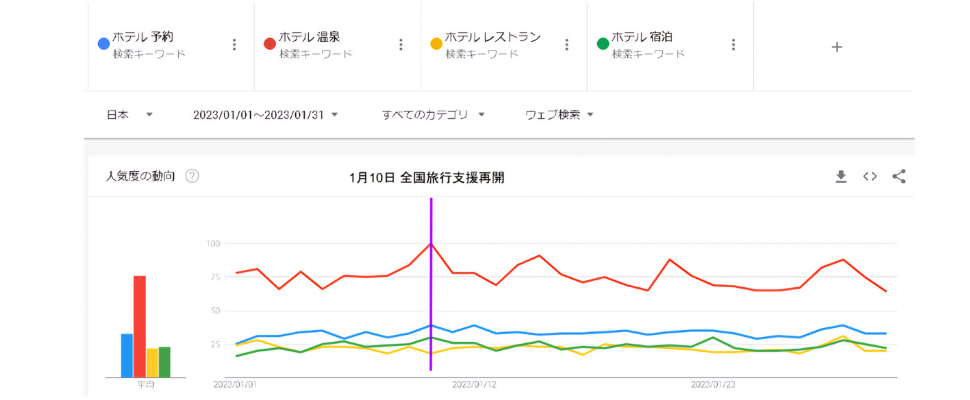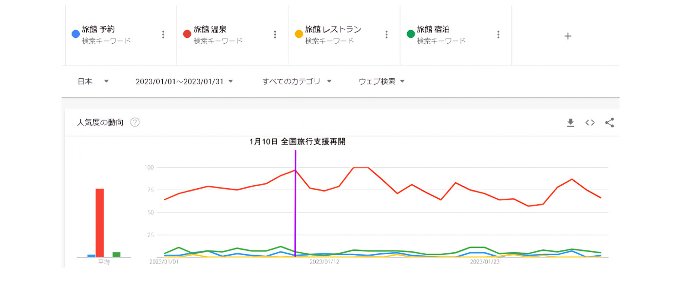 再開の10日までは、推移は低下傾向にありましたが、全国旅行支援再開後はどのキーワードも大きな変化はなかったように見えます。
