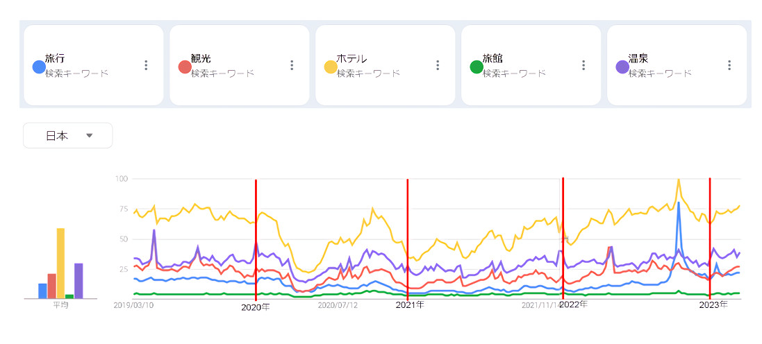 そのような社会情勢の中で、コロナ前からコロナ後で旅行に関連したキーワードの検索推移はどのようになったのか見ていきましょう。