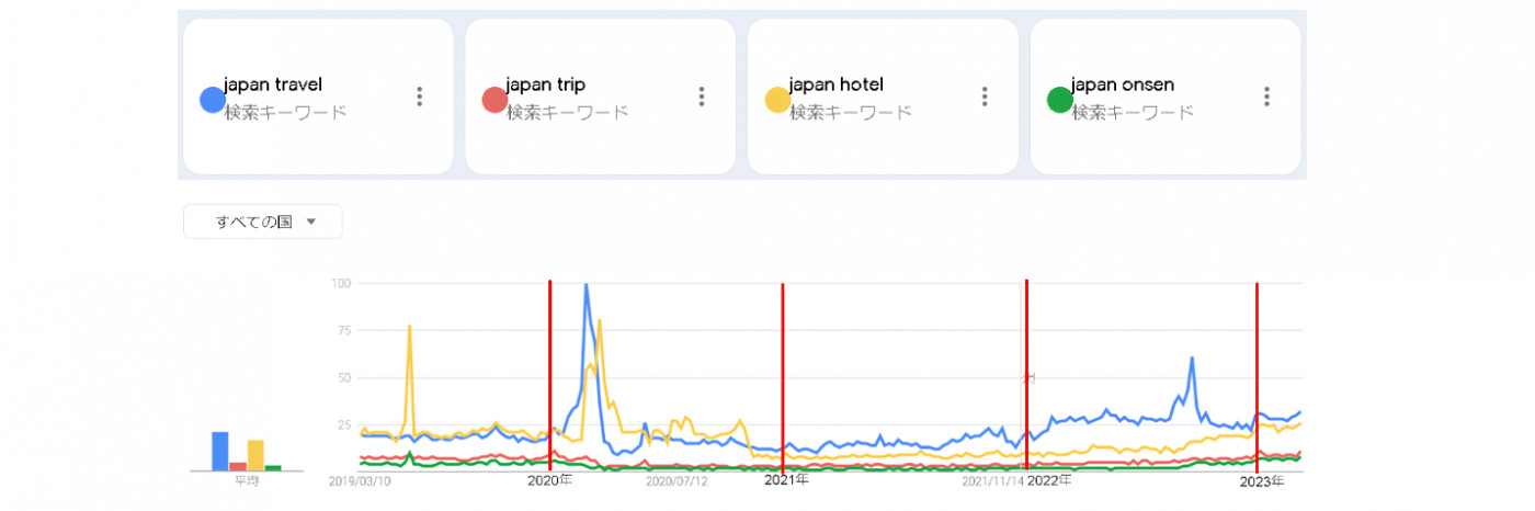 それ以降は、入国規制や水際対策が強化されたことにより、いずれのキーワードでも大きな変化は見られませんでした。しかし、2022年の終わり頃から「japan hotel」がじわりと増加傾向にあります。