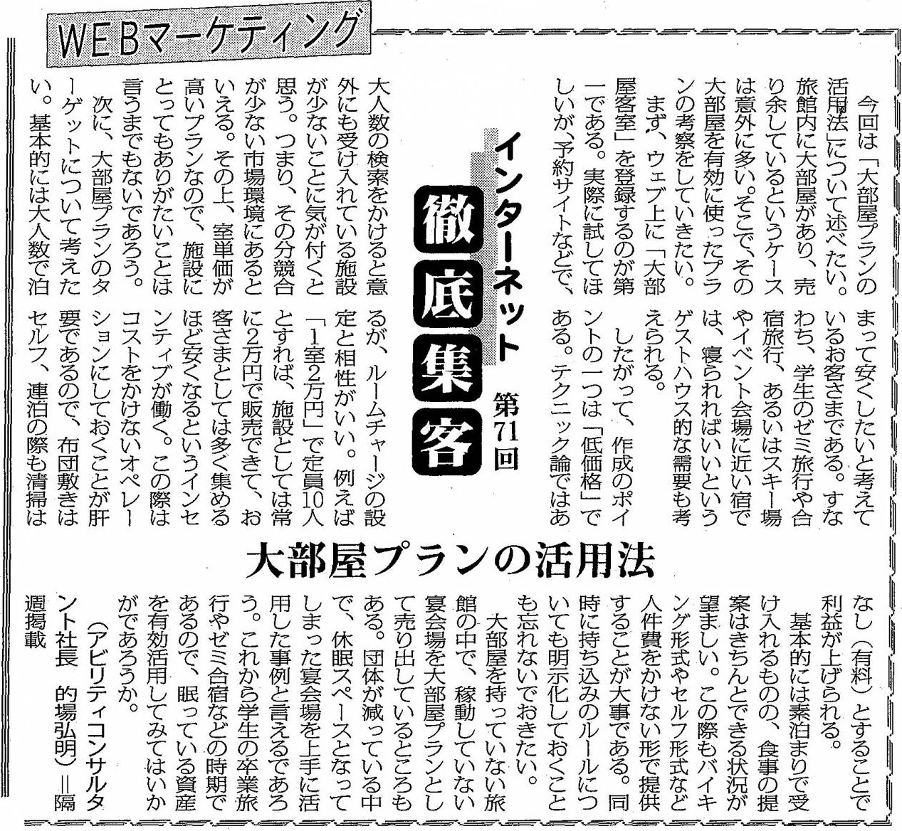 週刊観光経済新聞にて、弊社社長の的場が「インターネット徹底集客」と題したコラムを掲載しています。