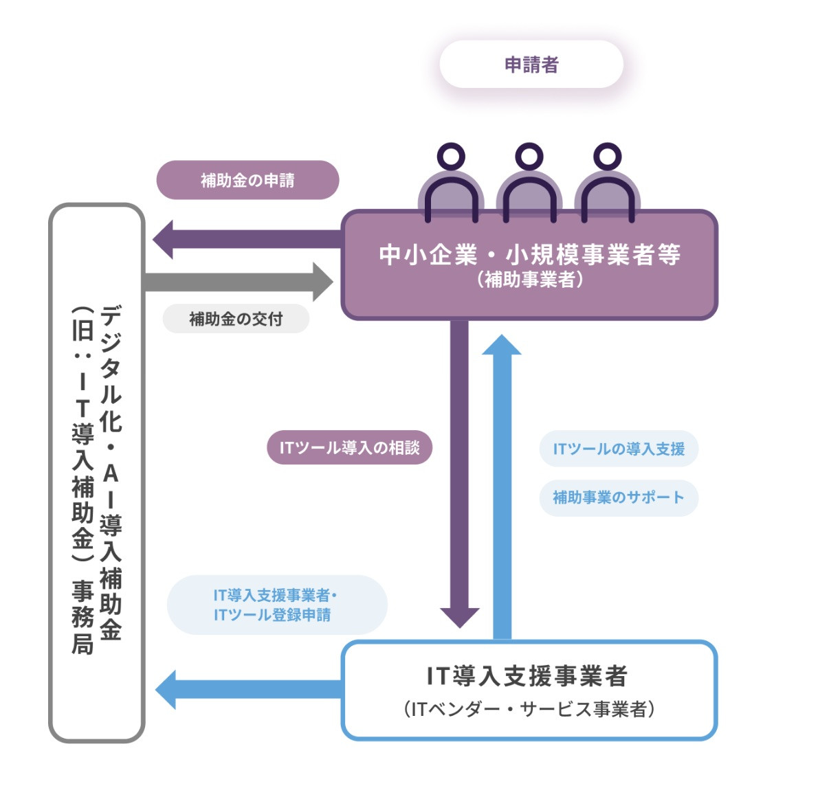補助金申請者(中小企業・小規模事業者等のみなさま)は、デジタル化・AI導入補助金事務局に登録された「IT導入支援事業者」とパートナーシップを組んで申請することが必要となります。※1