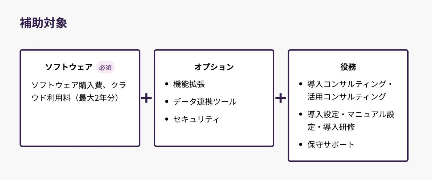 また、相談対応等のサポート費用やクラウドサービス利用料等も補助対象に含まれます。