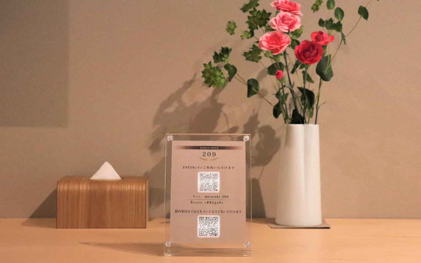 QRコードは各客室内のWi-Fi情報近くに置き、目につくような動線を形成。