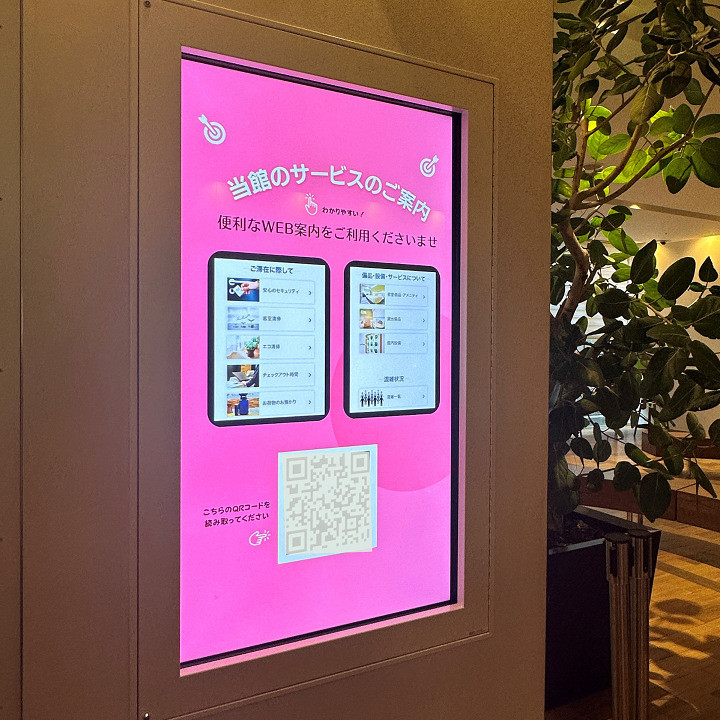 1400室という規模とお客様数を踏まえ、室内・館内のデジタルサイネージ・エレベーターの掲示板などにQRコードを設置することで、多くの人の目に触れる動線を形成。